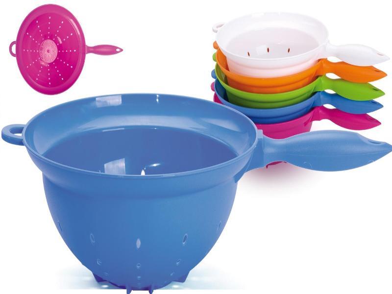 Escurreverduras manual de mango en polipropileno. Colores surtidos. Medidas desde el mango 37.5cm. ancho 22,5 cm y altura 11.5cm.