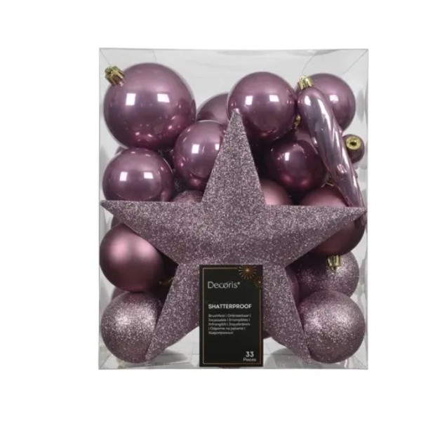 Set de decoración navideña compuesto por 33 piezas en tono rosa vintage, que incluye bolas, estrella y adornos variados con acabados brillantes y con purpurina.