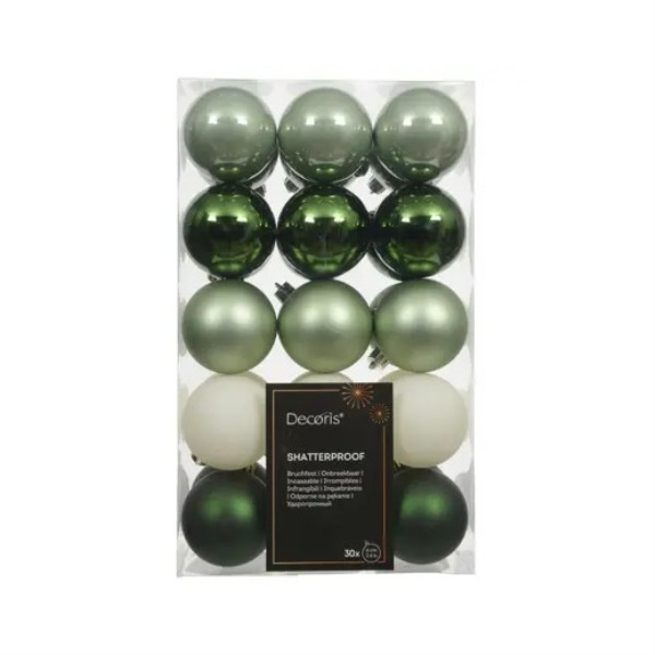 Set de 30 bolas de 6 cm en tonos verdes y blancos con acabados mate, brillantes y satinados.
