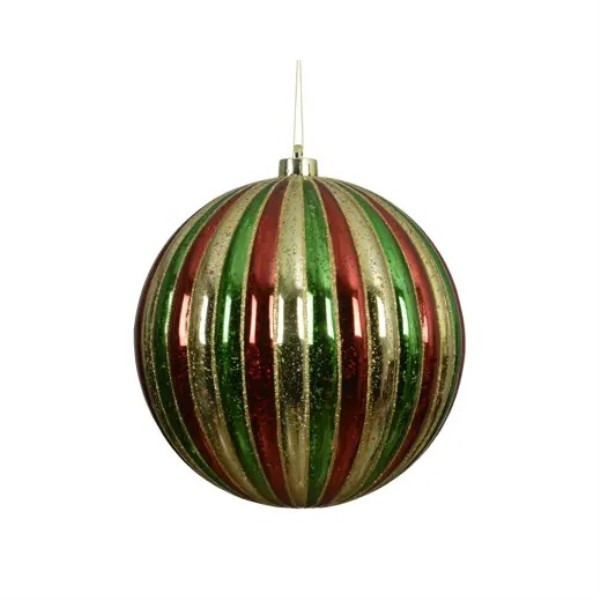 Bola de navidad de 20 cm decorada con rayas rojas, verdes y doradas.