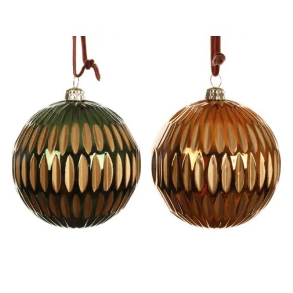 Bola de Navidad de 8 cm con relieve metálico en tonos verde y cobre, ideal para dar un toque sofisticado y moderno a tu árbol. Precio unidad.