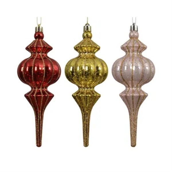 Adorno de poliestireno con brillo disponible en varios colroes (rojo-dorado-rosa), perfecto para añadir un toque elegante. Precio unidad. Medidas: 7,2x7,2x18,2 cm.