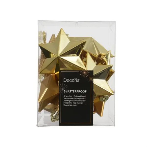Set de 12 adornos diseño estrella en color dorado con varios acabados, ideales para decorar el árbol. Medidas: 9x9x12,3 cm.