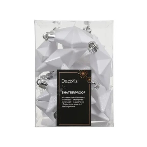 Set de 12 adornos diseño estrella en color blanco con varios acabados, ideales para decorar el árbol. Medidas: 9x9x12,3 cm.