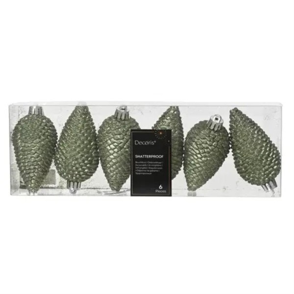 Set de 6 piñas colgantes de 4,5 cm en color verde con acabado texturizado, perfectas para añadir un toque invernal y elegante a tu árbol.