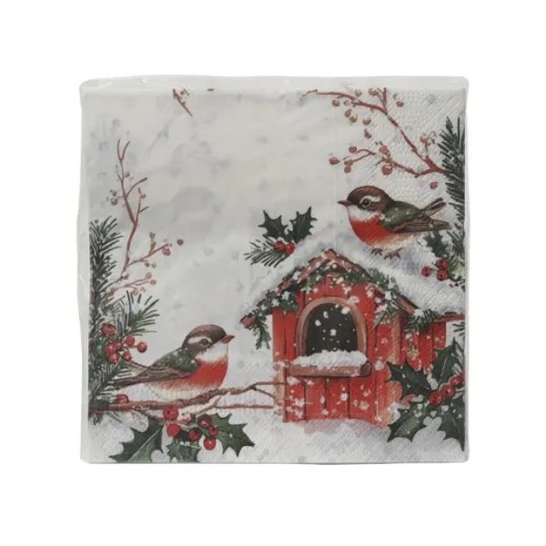 Pack de 20 servilletas navideñas de papel de 33 cm con diseño invernal de pajaritos, ramas y una casita roja nevada, perfecto para decorar la mesa con un toque cálido y natural.