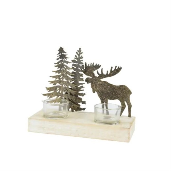 Portavelas con diseño de reno y abetos en acabado brillante dorado. Ideal para ambientar tu hogar con un toque rústico y festivo durante la Navidad. Medidas: 8,5x20x16,5 cm.