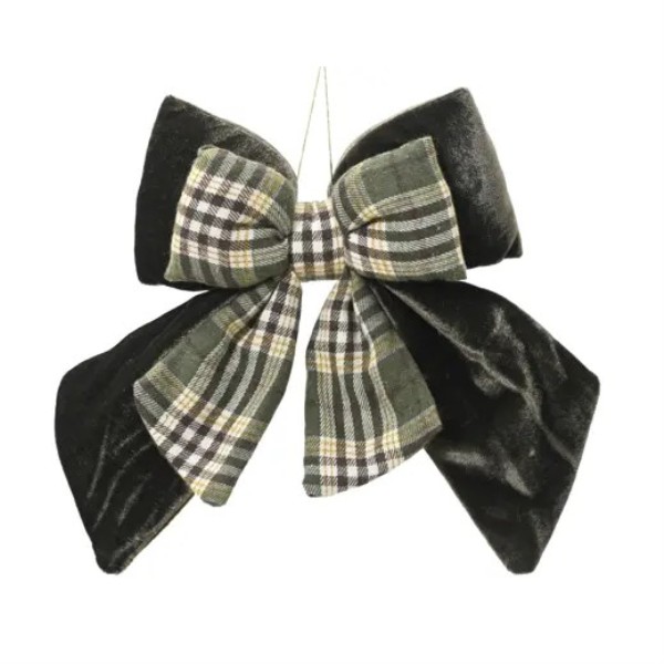 Lazo decorativo de terciopelo verde con detalles de cuadros escoceses, ideal para adornar el árbol o crear un ambiente navideño elegante y acogedor. Medidas: 18x23x4,5 cm.