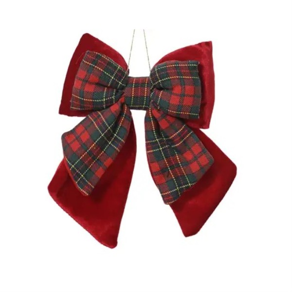 Lazo decorativo de terciopelo rojo con detalles de cuadros escoceses, ideal para adornar el árbol o crear un ambiente navideño elegante y acogedor. Medidas: 4,5x18x23 cm.