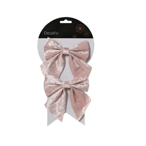 Set de 2 lazos decorativos de poliéster de 13 cm en tono rosa con acabado aterciopelado. Ideales para adornar el árbol de Navidad, coronas o regalos con un toque elegante y delicado.