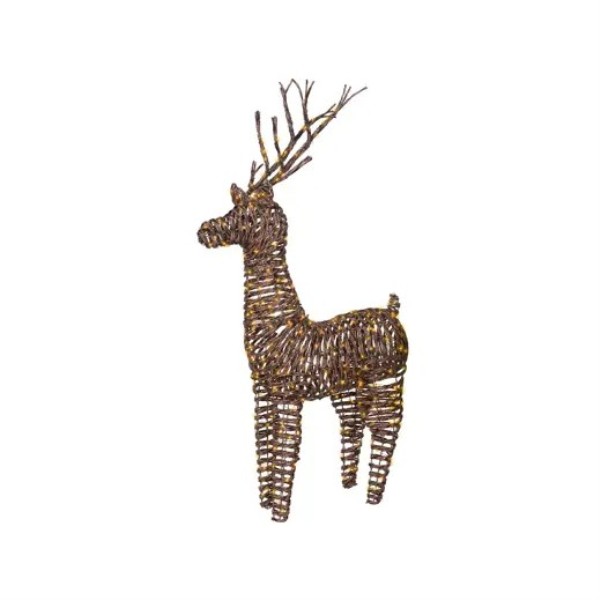 Crea una atmósfera cálida y mágica con este reno de mimbre sintético iluminado con 360 luces LED en tono cálido. deal para decorar tanto interiores como exteriores, esta figura combina elegancia natural con la magia de la Navidad. Medidas: 24x60x104 cm.