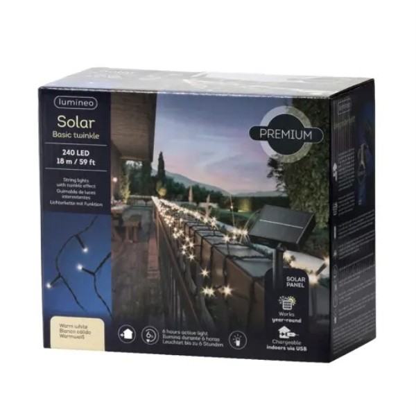 Disfruta de una iluminación navideña sostenible con esta guirnalda solar con 240 LED en tono blanco cálido, distribuidos en 18 metros. Recargable por USB para días nublados y 8 funciones de luz.