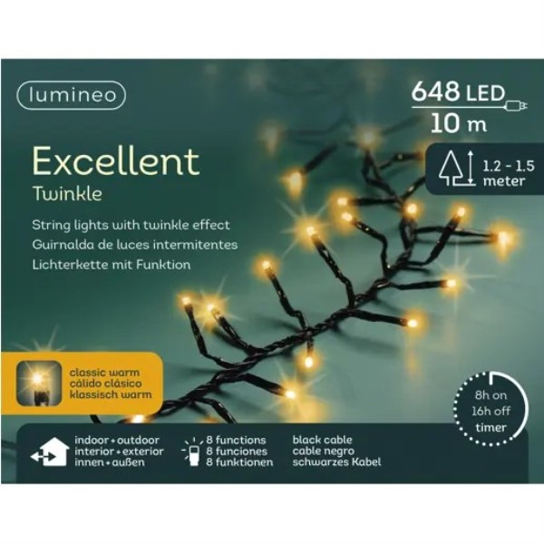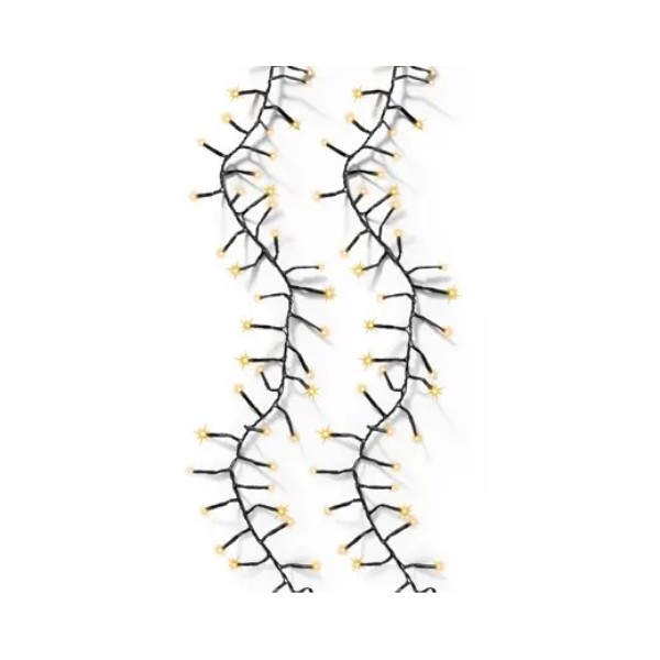 Esta guirnalda cuenta con 648 luces LED en color blanco cálido, distribuidas a lo largo de 10 metros. Perfecta para árboles de entre 1,2 y 1,5 metros. Apta para uso en interiores y exteriores.