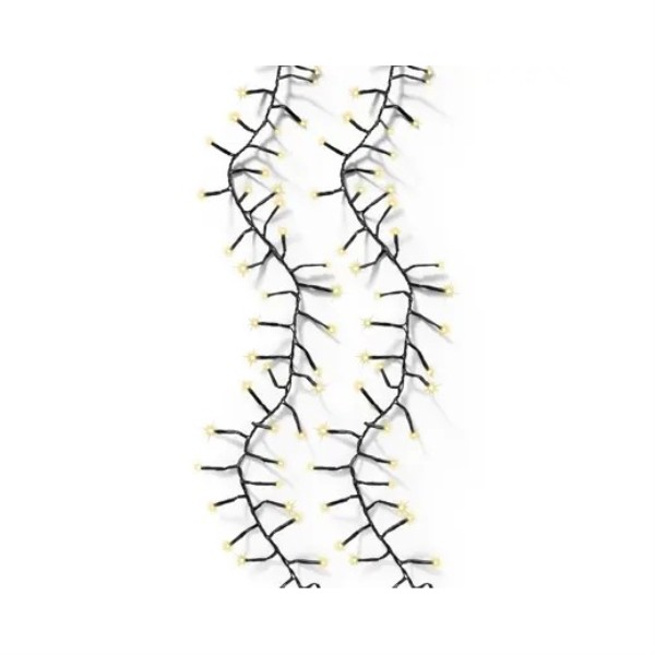Esta guirnalda cuenta con 960 luces LED en tono oro suave, distribuidas a lo largo de 15 metros. Perfecta para árboles de entre 1,5 y 1,8 metros. Apta para uso en interiores y exteriores.