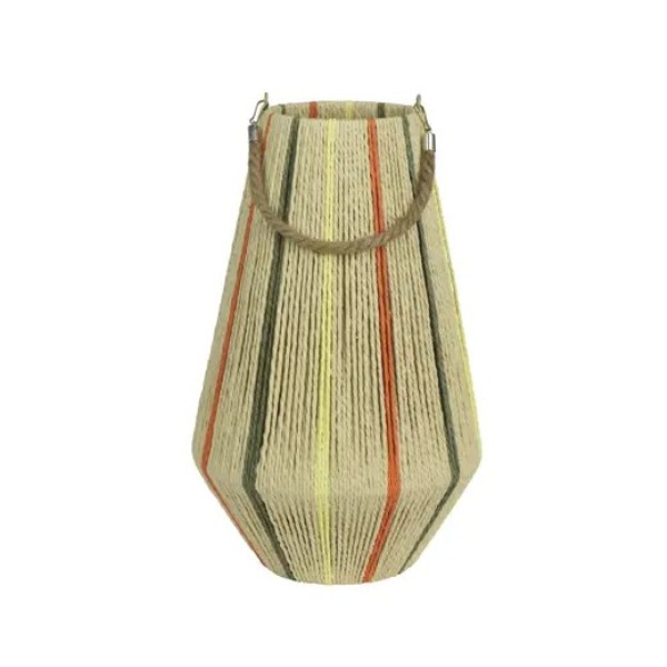 Farol decorativo de cuerdas de yute natural, ideal para crear ambientes cálidos y acogedores. Su diseño trenzado con detalles en tonos naturales y líneas decorativas aporta un estilo boho y mediterráneo. Dimensiones: Diámetro 28 cm x Alto 45 cm.
