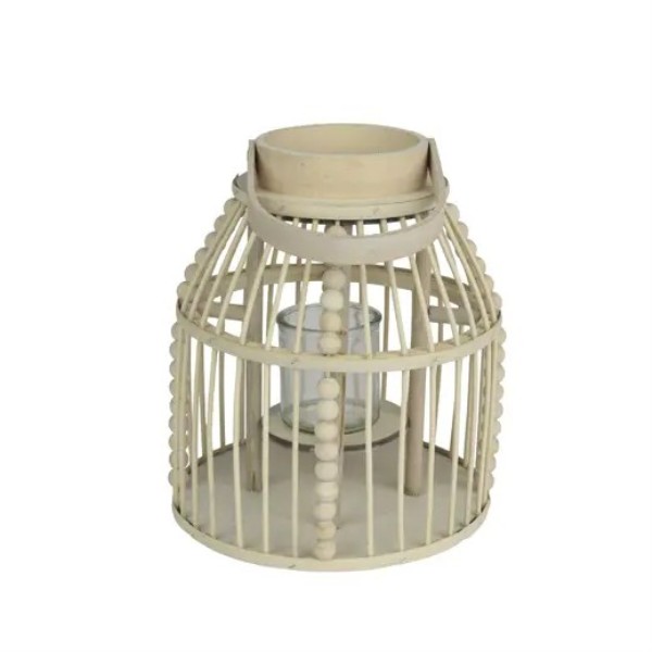 Farol decorativo de madera, ideal para crear un ambiente cálido y acogedor en interiores o terrazas cubiertas. Su diseño tipo jaula con detalles decorativos y portavelas interior de cristal aporta un estilo natural y elegante. Dimensiones: Diámetro 23 cm x Alto 39 cm.