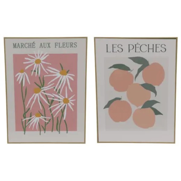 Cuadro decorativo de pared 30 x 40 cm, disponible en modelos surtidos con ilustraciones florales y frutales de estilo artístico y tonos suaves. Diseño moderno con inspiración francesa, ideal para aportar un toque elegante y delicado al salón, cocina o dormitorio. Medidas: 30 x 40 cm.