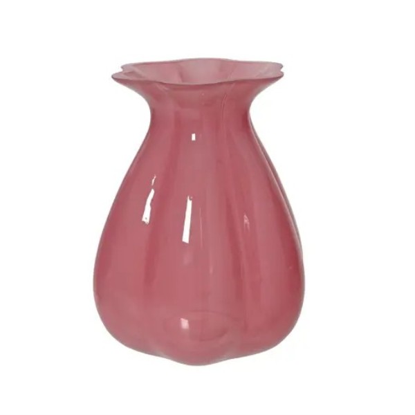 Jarrón de cristal en color rosa con acabado brillante y forma redondeada de líneas suaves, ideal para decorar cualquier estancia o realzar arreglos florales. Medidas: 20 x 25 cm.