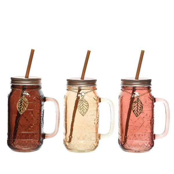 Jarra de cristal con cañita y tapa y decoración de hoja de metal con cadena. Disponible en 3 colores surtidos. Medidas 8,5x12x16,5cm.