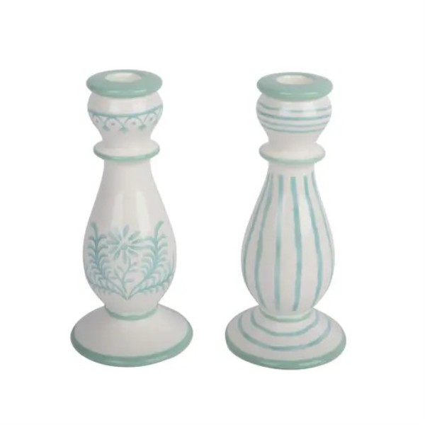 Candelabro de cerámica disponible en dos modelos decorativos con delicados detalles en relieve y acabado en tonos blancos y azul agua, ideal para aportar un toque fresco y elegante a cualquier estancia. Medidas: 10 x 10 x 22 cm.