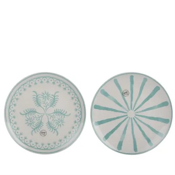 Plato llano de porcelana de 27 cm de diámetro, disponible en dos modelos decorativos en tono azul agua sobre fondo blanco. Su diseño suave y luminoso aporta un estilo fresco y delicado a la mesa, perfecto para el día a día o para ocasiones especiales.