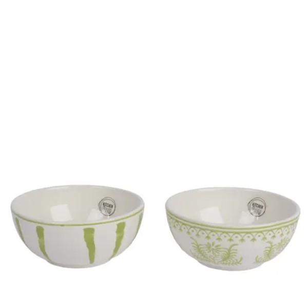 Bol de porcelana disponible en dos modelos decorativos con delicados detalles en tonos verdes sobre fondo blanco, ideal para servir o como elemento decorativo en la mesa. Medidas: 14 x 8 cm.