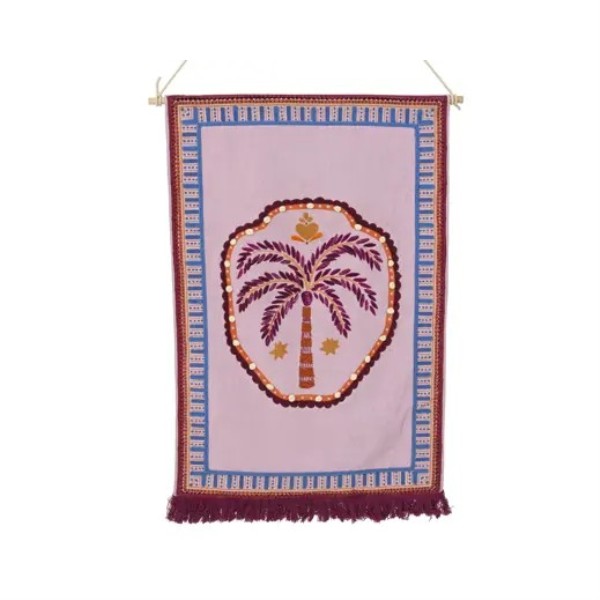Tapiz decorativo de pared confeccionado en algodón, con diseño central de palmera bordada en tonos cálidos y marco decorativo en contraste. Incluye barra superior para colgar y acabado inferior con flecos, aportando un estilo boho y mediterráneo. Medidas aproximadas: 60 x 90 x 0,5 cm.