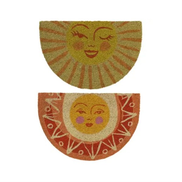 Felpudo diseño sol ideal para aportar un toque original y cálido a la entrada del hogar. Presenta modelos semicirculares con ilustraciones de sol en colores vivos que crean un ambiente acogedor desde el primer momento. Disponible en dos modelos. Dimensiones: Largo 40 cm x Ancho 60 cm.