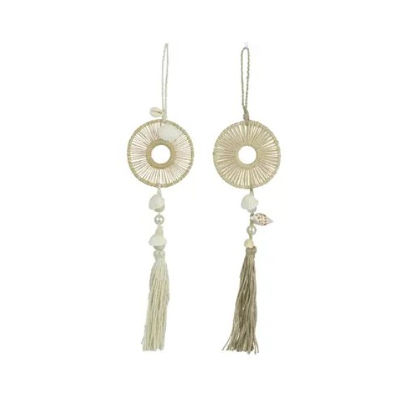 Colgante decorativo de estilo boho y natural, elaborado con estructura circular de fibras trenzadas, detalles de conchas y borla inferior decorativa. Disponible en tonos neutros que combinan fácilmente con cualquier ambiente. Medidas: 9 x 32 cm.