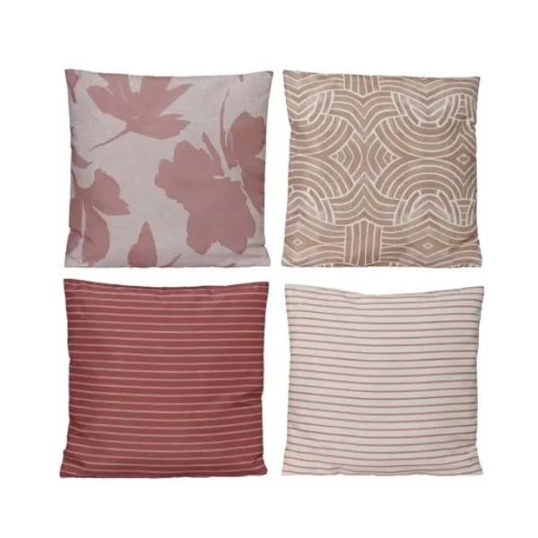 Cojín cuadrado surtido de 45x45 cm, disponible en varios diseños decorativos con estampados florales, geométricos y de rayas en tonos rosados y beige, ideal para aportar un toque elegante y acogedor a cualquier estancia del hogar.
