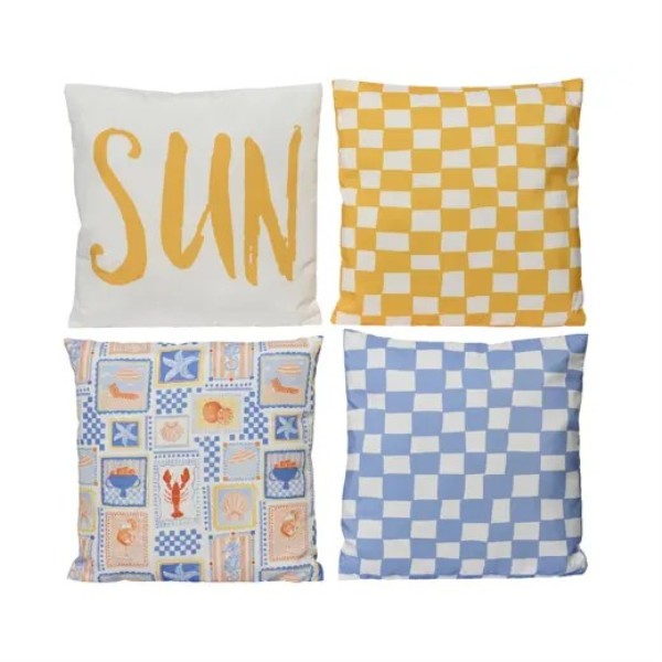 Cojín cuadrado confeccionado en poliéster, disponible en 4 modelos surtidos con diseños modernos y veraniegos on medidas de 45x45 cm, ideal para aportar un toque decorativo y fresco a cualquier estancia.