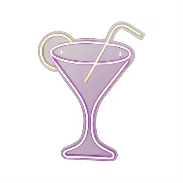 Letrero con diseño de copa cocktail tipo neon ideal para aportar un toque moderno y divertido a cualquier espacio. Funciona con conexión USB y está diseñada para uso en interior. Sus dimensiones son 1,6 cm de largo, 32 cm de ancho y 43 cm de alto.