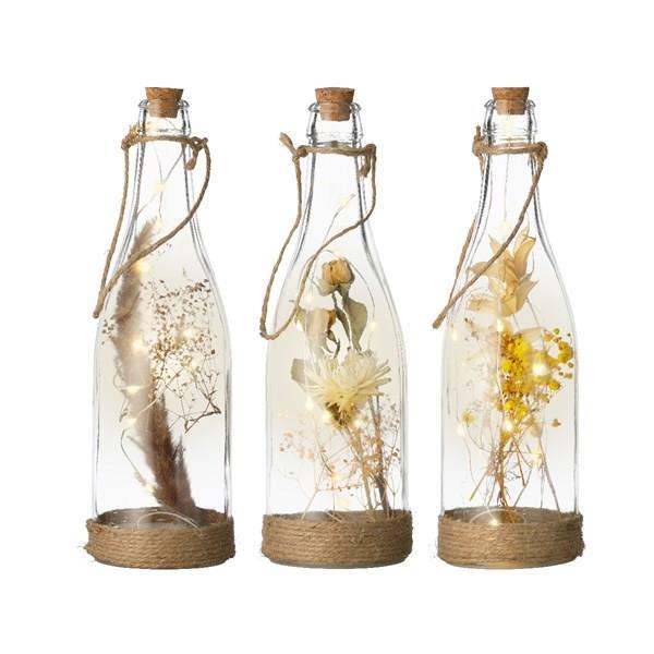Botella de cristal decorativa con micro luces led color balnco cálido y flores secas en su interior. Funciona con pilas (no incluidas). Disponible en varios modelos, puede indicar el modelo deseado en el comentario del pedido. Medidas: 7x23 cm.