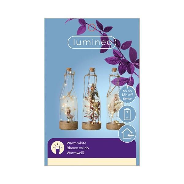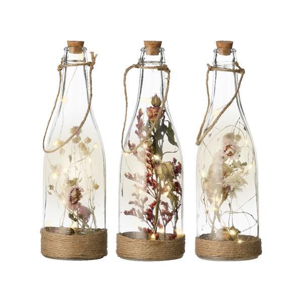 Botella de cristal decorativa con micro luces led color balnco cálido y flores secas en su interior. Funciona con pilas (no incluidas). Disponible en varios modelos, puede indicar el modelo deseado en el comentario del pedido. Medidas: 7x23 cm.
