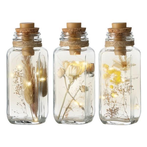 Botella de cristal con micro luces led y flores secas en su interior, con pila incluida. Disponible en varios modelos, puede indicar el modelo deseado en el comentario del pedido. Medidas: 5x5x15 cm.