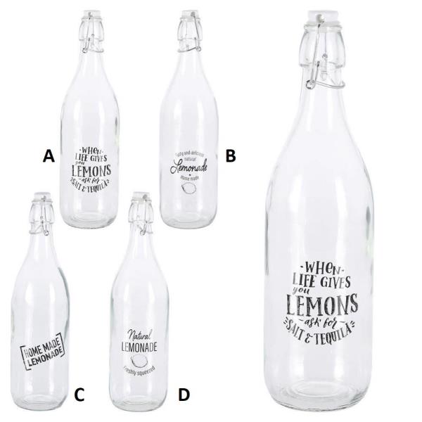 Botella agua de cristal de 1 litro de capacidad disponible en varios modelos (A-B-C-D). Puede indicar el modelo deseado en el comentario del articulo.