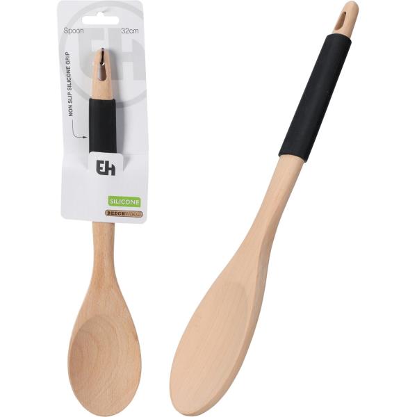 Cuchara de madera con agarre de silicona. Medida: 32 cm.