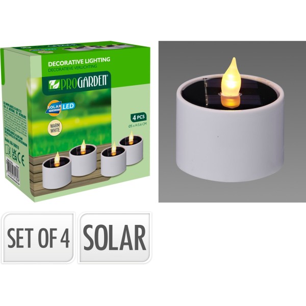 Ilumina tus espacios exteriores de forma práctica y decorativa con este set de 4 velas solares tipo té. Su luz cálida crea un ambiente acogedor, ideal para jardines, terrazas o balcones. Medidas: 5 x 5,6 cm.