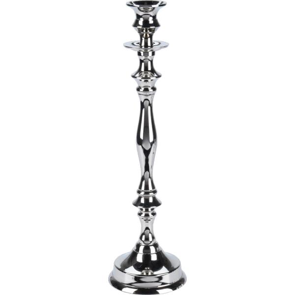 Candelabro metálico color plata. Medida: 36,5 cm.