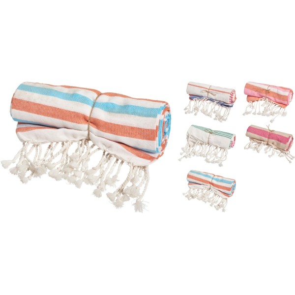 Lleva contigo la combinación perfecta de estilo y funcionalidad con esta toalla hammam de 90 x 170 cm. Su diseño elegante de rayas y flecos la convierte en el complemento ideal para la playa, la piscina o tus viajes. Disponible en varios colores.