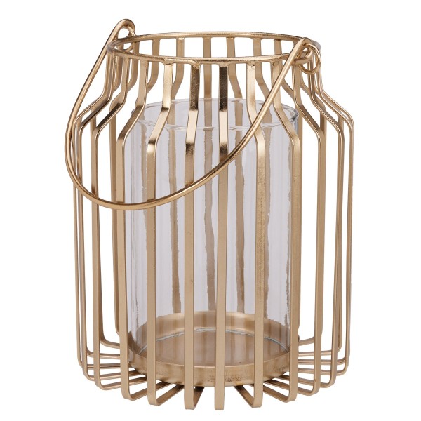 Ilumina tus espacios con estilo gracias a este elegante farol metálico en tono oro. Medidas: 18x21 cm.