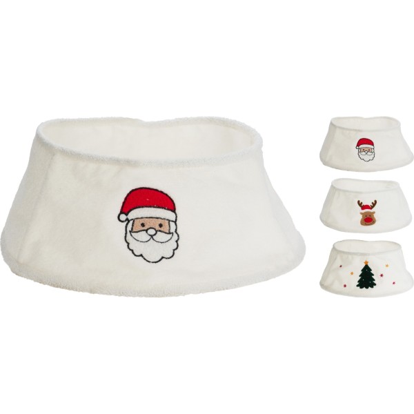 Decora la base de tu árbol con esta encantadora falda de poliéster en color blanco con suaves acabados y bordados navideños. Modelos surtidos: Santa, reno y árbol navideño. Medidas: 60x40x25 cm.