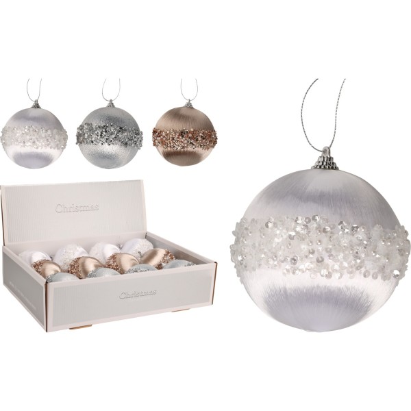 Añade elegancia y brillo a tu decoración navideña con estas bolas de 10 cm adornadas con una franja central de lentejuelas y perlas brillantes. Colores surtidos: Blanco, plata y champán. Precio unidad.
