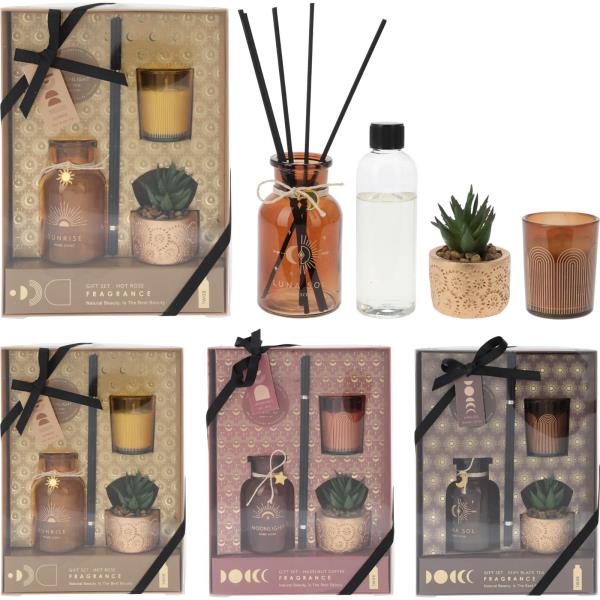 Pack fragancia que incluye ambientador, vela en vaso de cristal y maceta. Disponible en varios modelos (naranja-rojo-marrón), puede indicar el modelo deseado en el comentario del articulo.