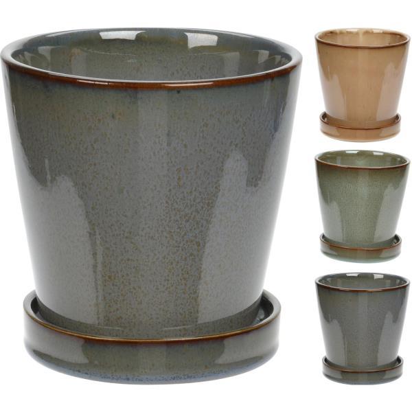 Macetero esmaltado con plato disponible en varios colores (marrón-gris-verde). Puede indicar el modelo deseado en el comentario del articulo. Medidas: 13,5x13,5 cm.