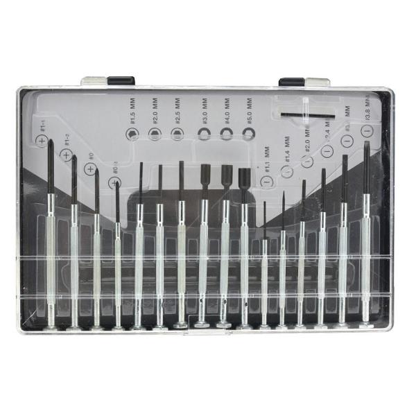 Estuche con 16 destornilladores de precisión. El juego incluye: Cruz: 1-1 1-2 0 0-2 Plano: 1,1 mm 1,4 mm 2,0 mm 2,4 mm 3,0 mm 3,8 mm Hexagonal macho: 1,5 mm 2,0 mm 2,5 mm Hexagonal hembra: 3,0 mm 4,0 mm 5,0 mm.
