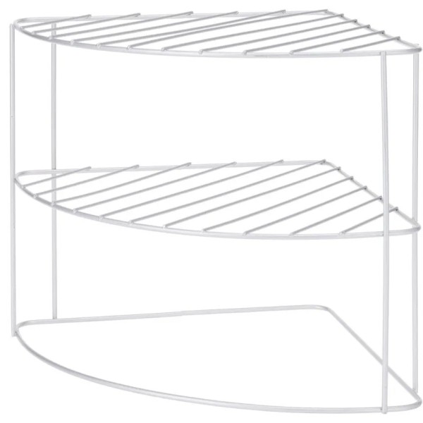 Organizador de cocina de 3 niveles, ideal para optimizar el espacio en esquinas de armarios o encimeras. Su diseño compacto y funcional permite almacenar platos, vasos, especias u otros utensilios de forma ordenada y accesible. Medidas: 23 x 23 x 21 cm.