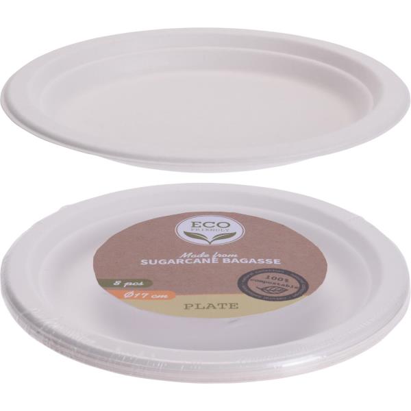 Plato biodegradable fabricado con fibra de caña de azúcar 100% compostable de 17 cm de diámetro. Pack de 8 unidades.