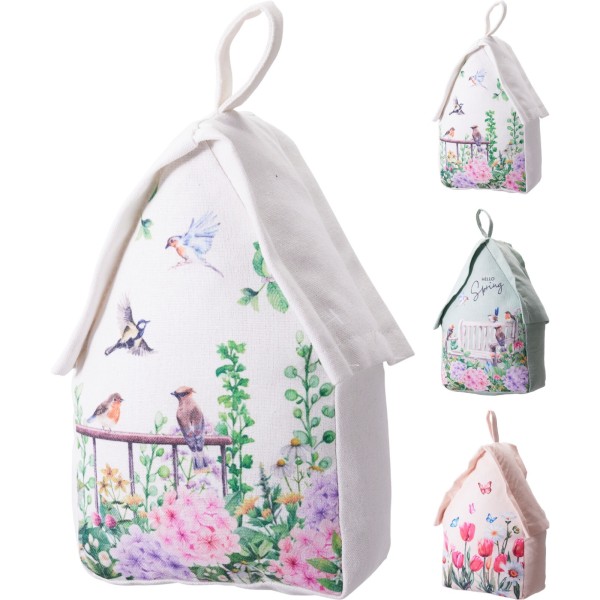 Añade un toque encantador a tu hogar con este tope de puerta decorativo en forma de casita. Su diseño floral con motivos de pájaros y estilo primaveral lo convierte en un elemento funcional y a la vez decorativo. Disponible en 3 modelos. Medidas: 15 x 22 cm.