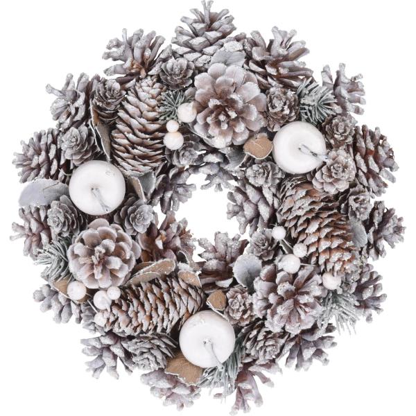 Corona navideña de 26 cm decorada con piñas efecto escarchado.